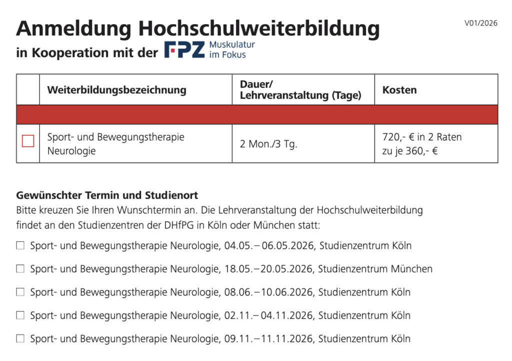 Die Hochschulweiterbildung Sport- und Bewegungstherapie Neurologie entspricht der FPZ NeuroTherapie